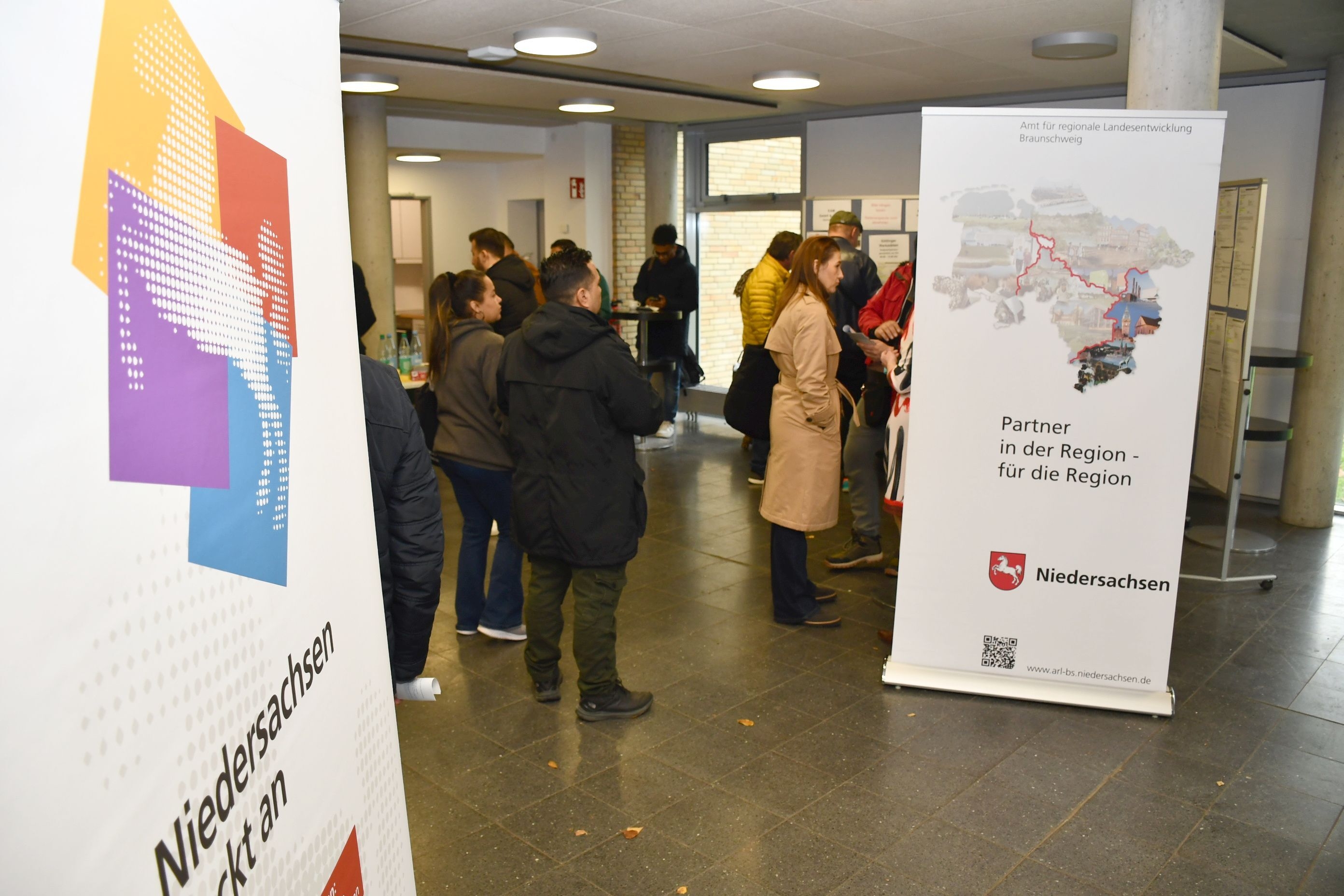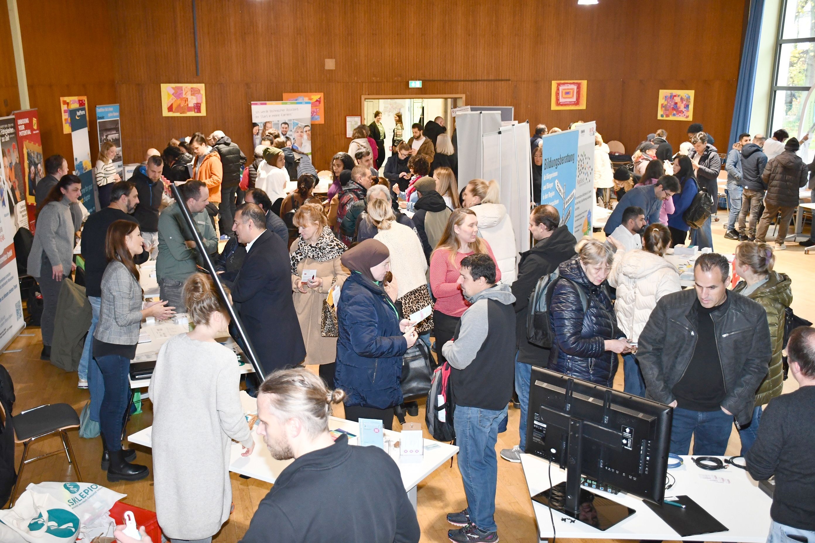 „Finde den Mut, beruflich neue Wege zu gehen“. Unter diesem Motto richtete sich die Integrationsmesse in der Mehrzweckhalle im Göttinger Stadtteil Grone am 14. November 2024 insbesondere an Menschen mit Zuwanderungsgeschichte. Etwa 350 Besucherinnen und Besucher nutzen die Gelegenheit, sich bei den 30 Unternehmen und Organisationen zu Jobs und Qualifizierungsvoraussetzungen zu informieren.