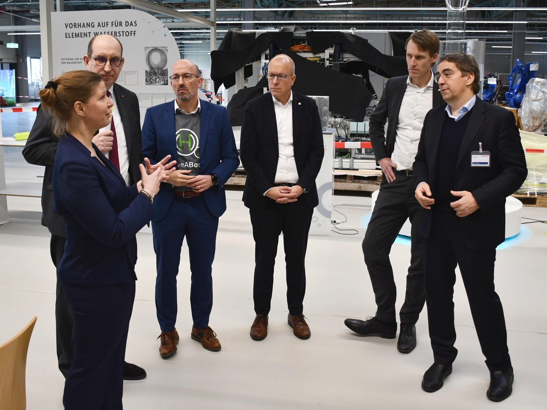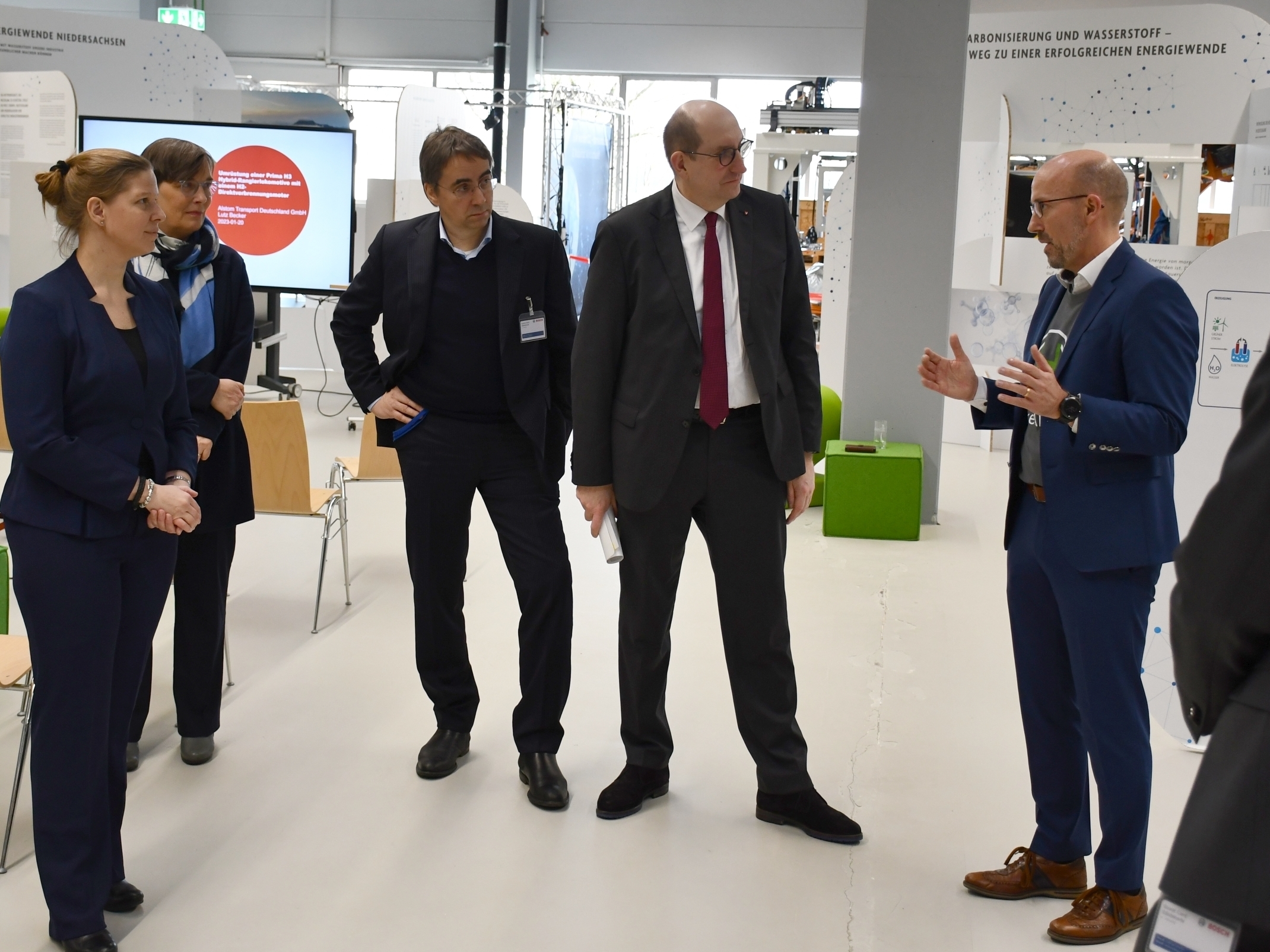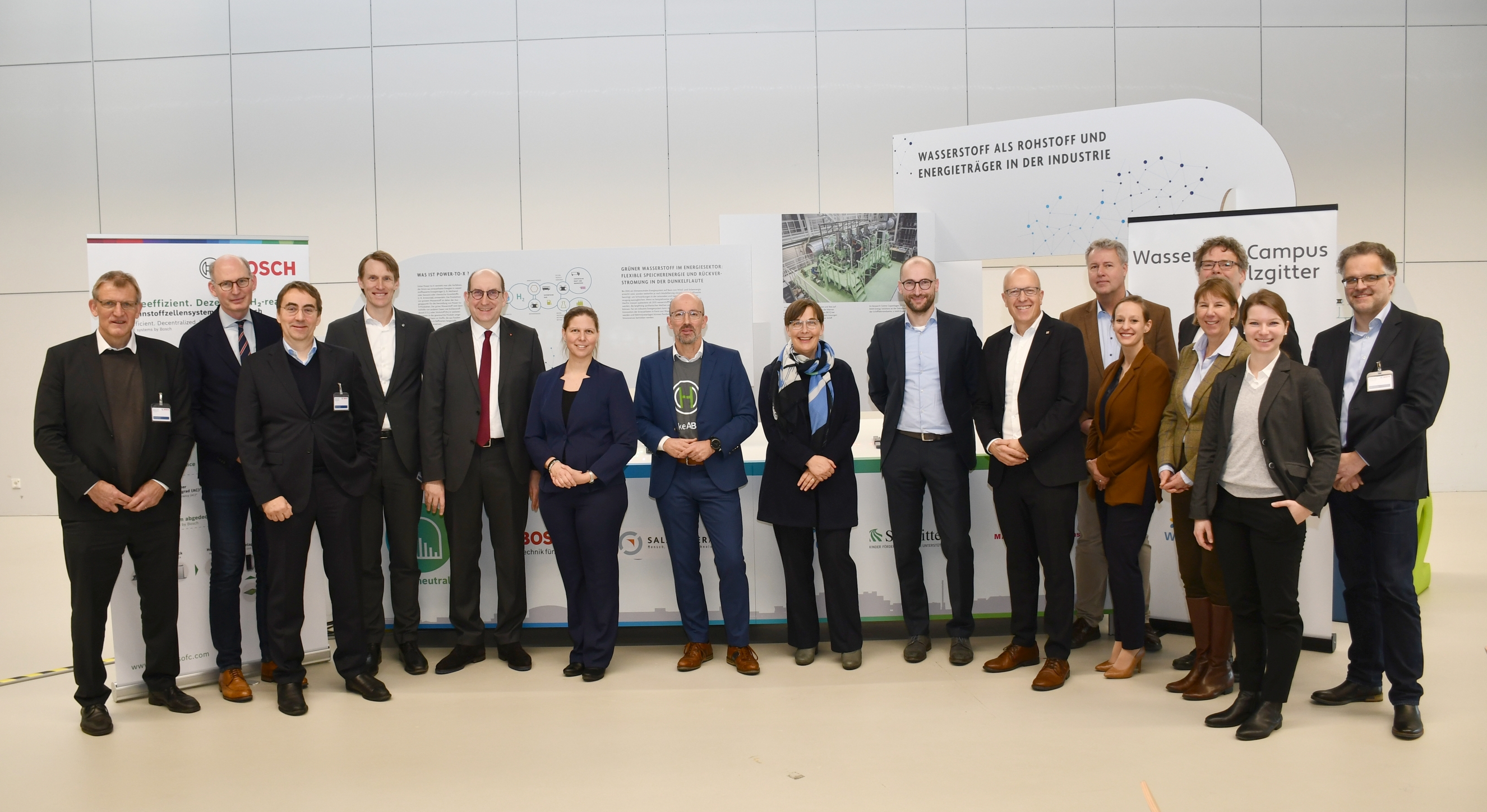 Am Wasserstoff Campus Salzgitter informierte sich die Ministerin anschließend über den Stand der geförderten Projekte und diskutierte mit Vertreterinnen und Vertretern aus Wissenschaft, Wirtschaft, Politik und Region die anstehenden Herausforderungen bei der Dekarbonisierung der Industrie und welchen Beitrag der Wasserstoff Campus Salzgitter hierbei leisten kann.