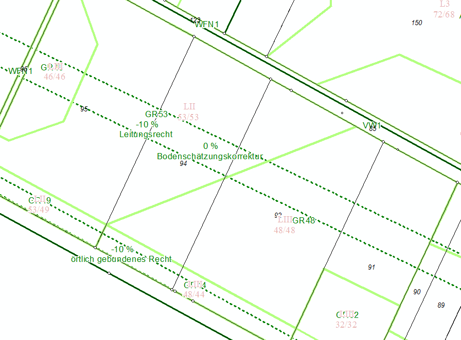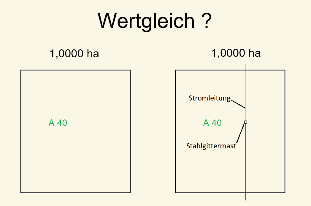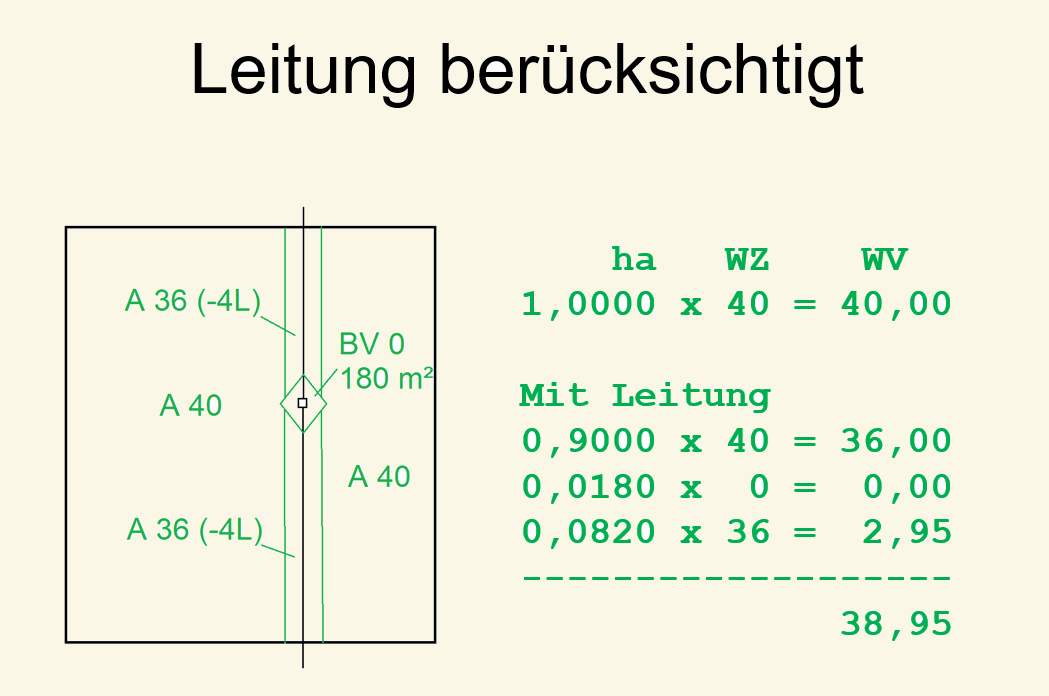 In den Beispielen wird fiktiv angenommen, dass im Wertermittlungsrahmen für Überspannungen von Flächen mit Stromleitungen Abwertungen der Acker bzw. Grünlandzahlen um 10% auf einer Breite von 10 m vorgesehen sind. Ferner sollen für Standorte von Masten eine Fläche von 180m² unberücksichtigt bleiben.