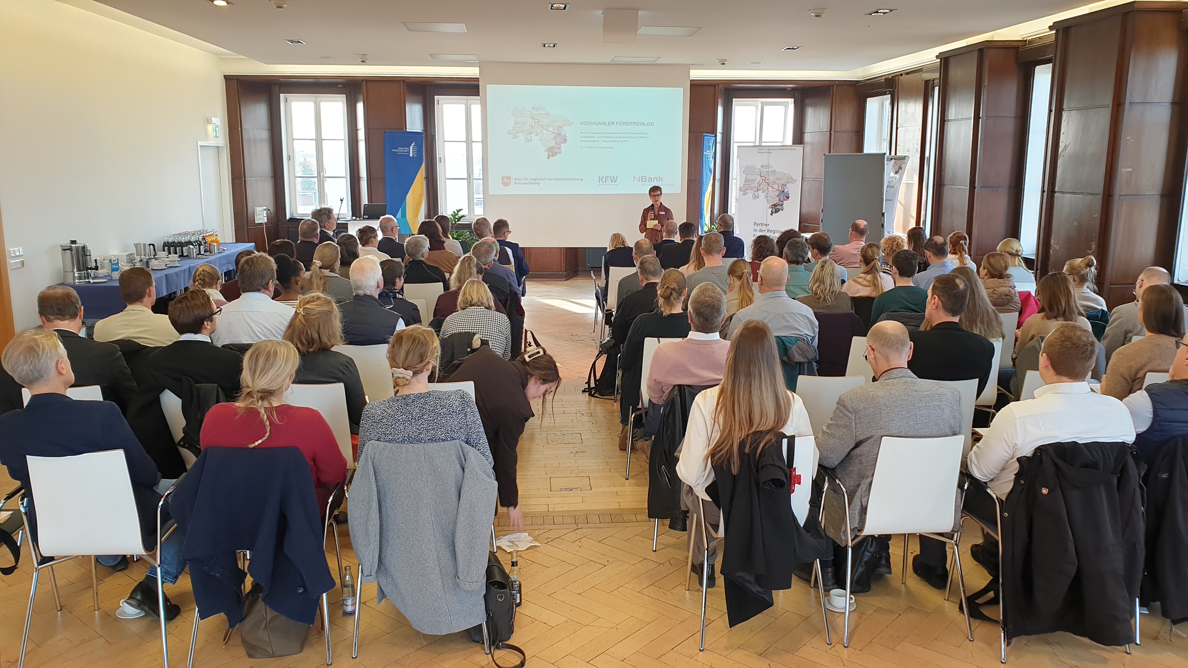Braunschweig. Was gibt es für Förderprogramme? Wen kann ich zu welchen Projekten ansprechen? Welche Voraussetzungen werden für spezielle Förderungen benötigt? Um diese Fragen ging es beim kommunalen Förderdialog, der am 13. November 2025 im Haus der Wissenschaft in Braunschweig stattfand. Gemeinsam mit der NBank und der KfW Bankengruppe hatte das Amt für regionale Landesentwicklung Braunschweig (ArL) alle Kommunen im Amtsbezirk zu diesem Austauschformat eingeladen. Rund 70 Förderexpertinnen und -experten nutzen die Gelegenheit, sich bei der Veranstaltung fachlich auszutauschen und sich zu vernetzen.