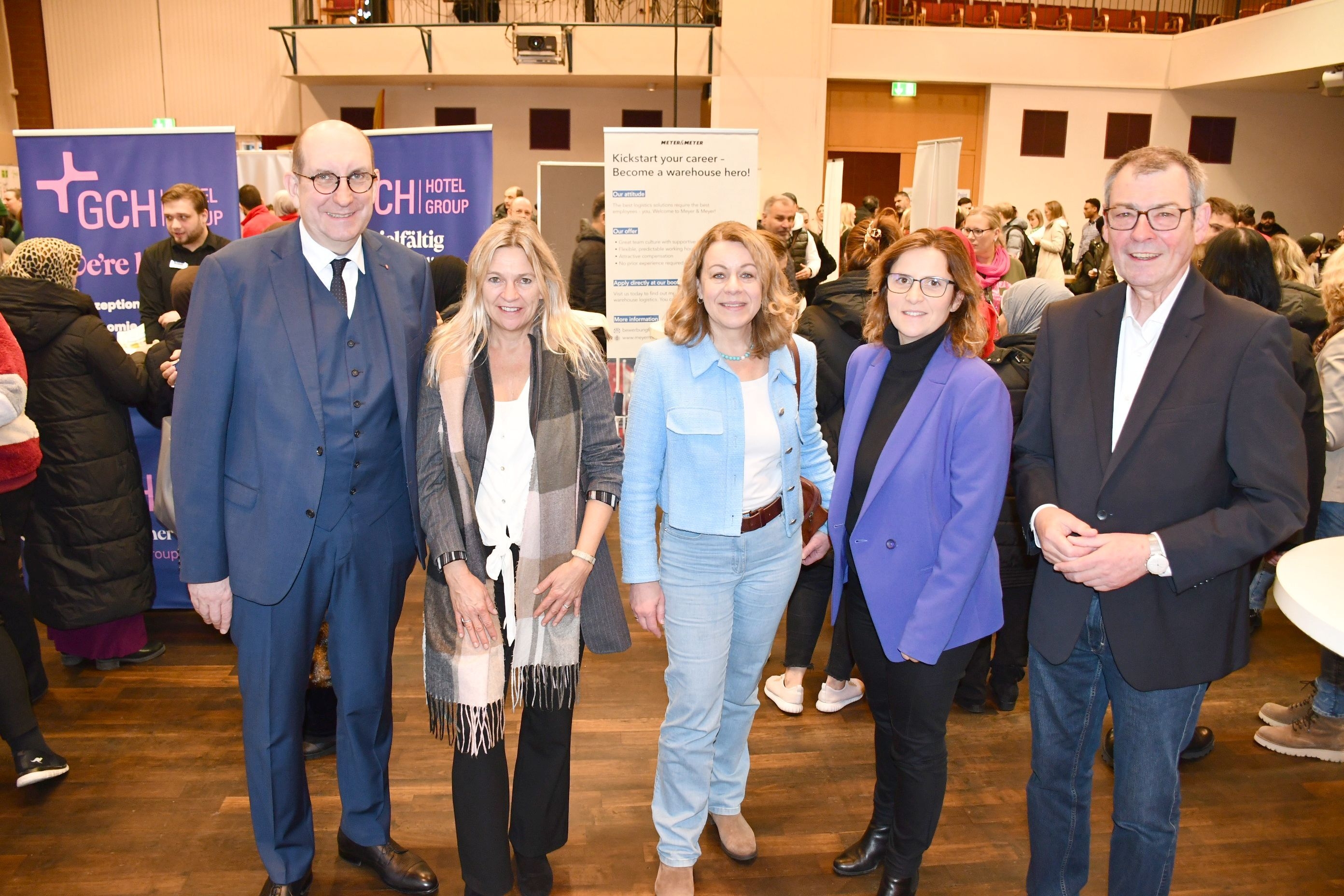 Begrüßten die teilnehmenden Unternehmen und Gäste der Jobmesse: (v.l.n.r.) Staatssekretär Matthias Wunderling-Weilbier; Prof. Dr. Andrea Friedrich, Sozialdezernentin Landkreis Peine; Evelyn Beger, Geschäftsführerin Agentur für Arbeit Hildesheim; Claudia Geyer, Jobcenter Peine; Matthias Möhle, stellvertretender Landrat Landkreis Peine