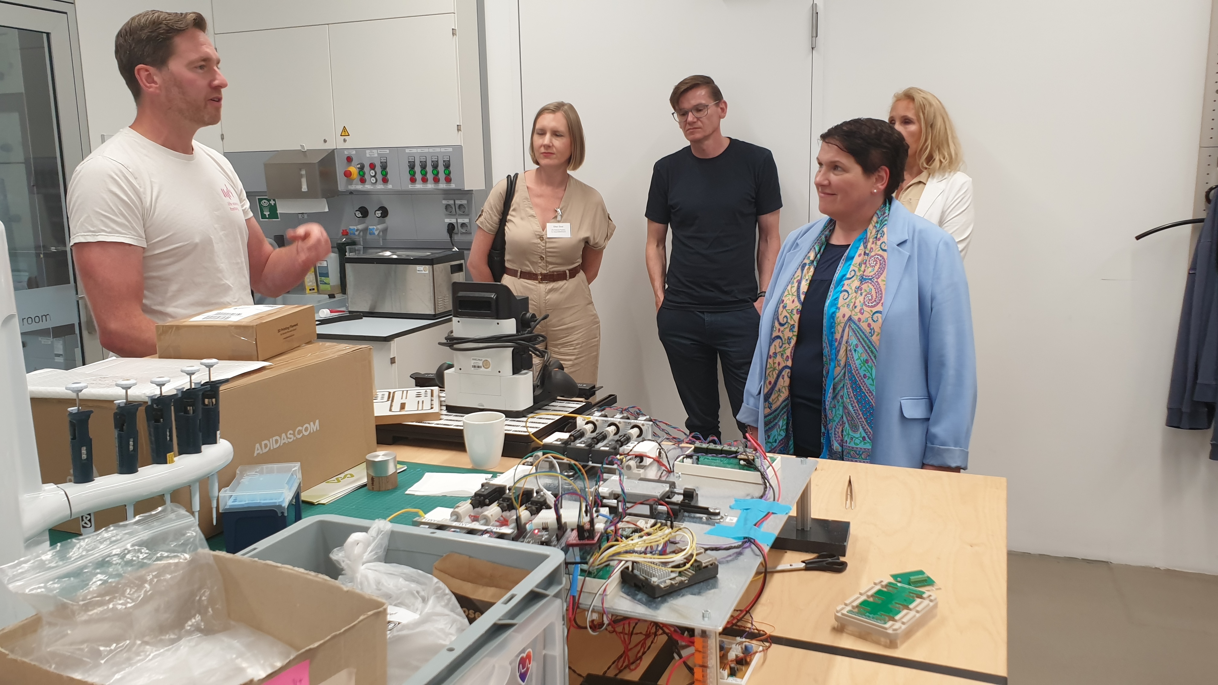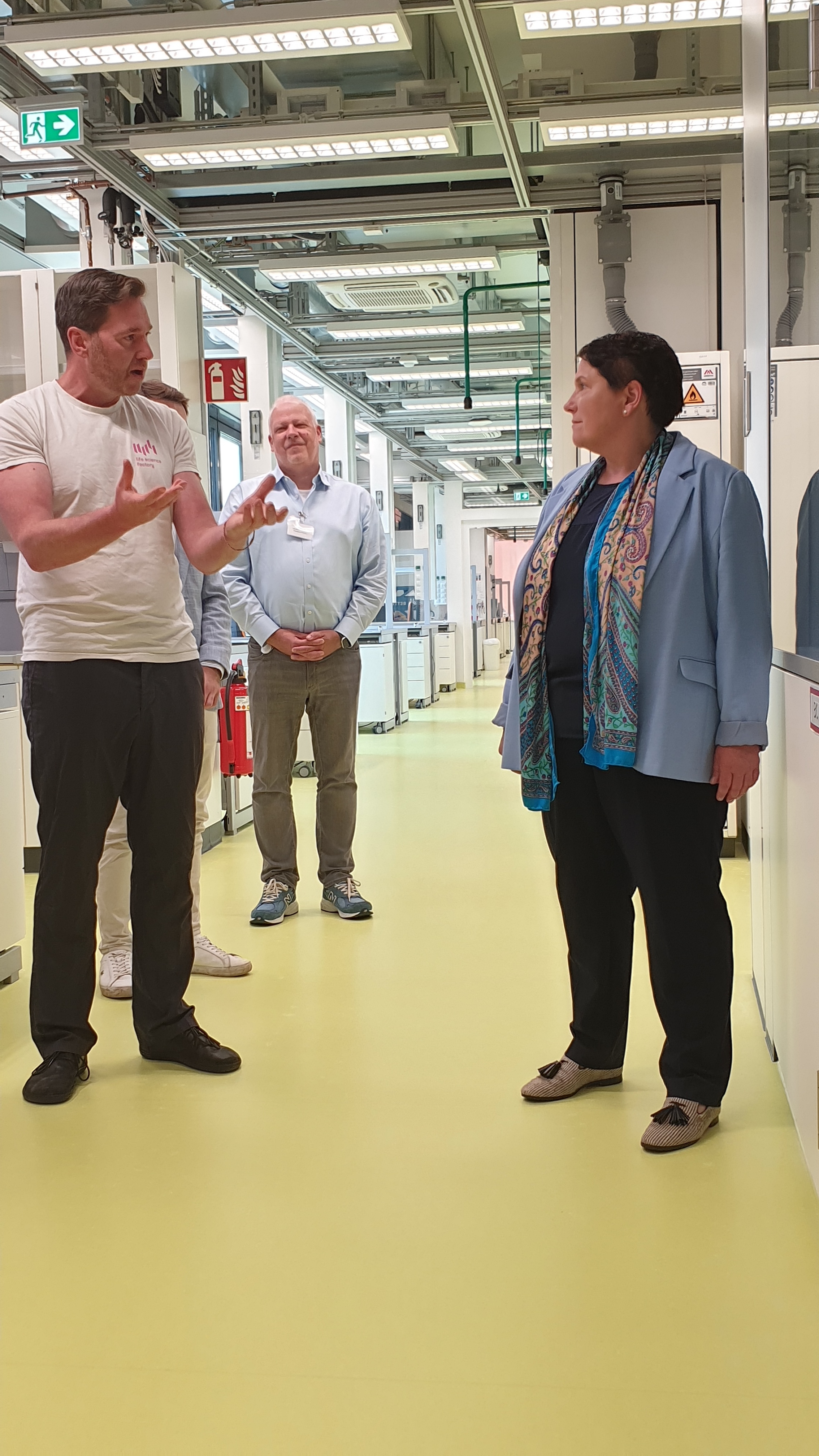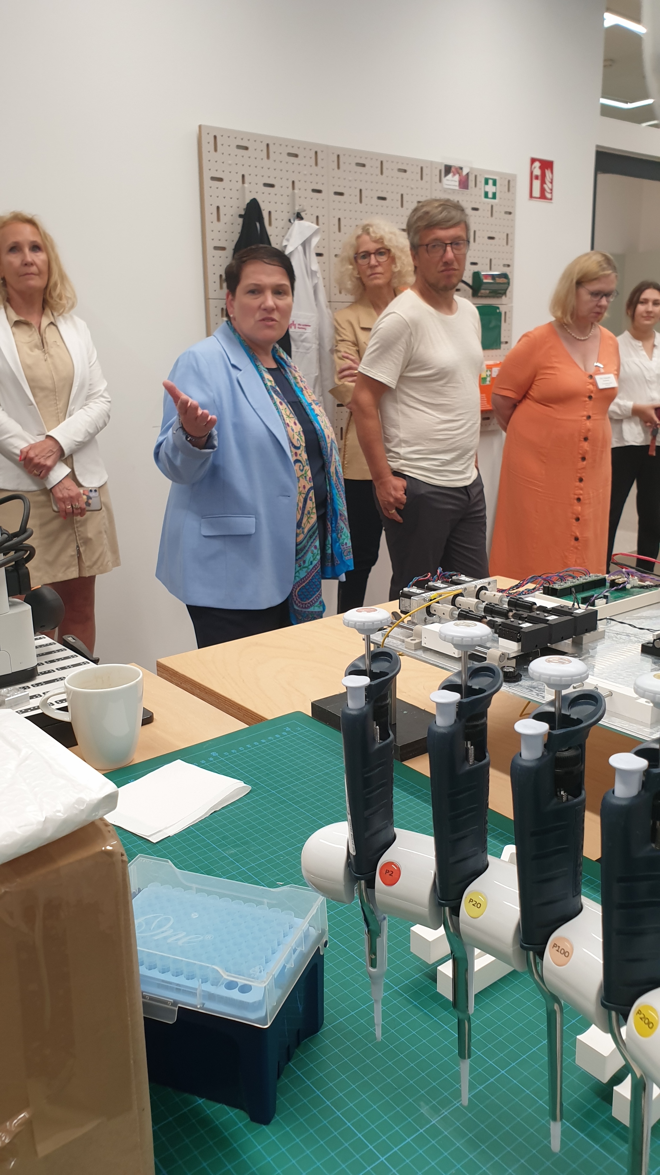 Ministerin Walter startete ihren Besuch in der Life Science Factory in Göttingen. Das Labor stellt Laborausrüstung und Coworking Spaces zur Forschung oder Prototyp-Entwicklung zur Verfügung. Dazu bietet es einen Rundum-Service für Forschende und hilft bei Unternehmensgründungen. Durch eine enge Kooperation mit Hochschulen, Forschungseinrichtungen und Unternehmen will die Life Science Factory die Region Südniedersachsen zu einem führenden Standort für Technologietransfer und Gründungen im Life Science Bereich entwickeln. Der Life Science Branche kommt damit eine zentrale Bedeutung für die künftige Entwicklung Südniedersachsens zu, denn sie stärkt die Wettbewerbsfähigkeit und die Attraktivität der Region als innovativer Wirtschaftsstandort.