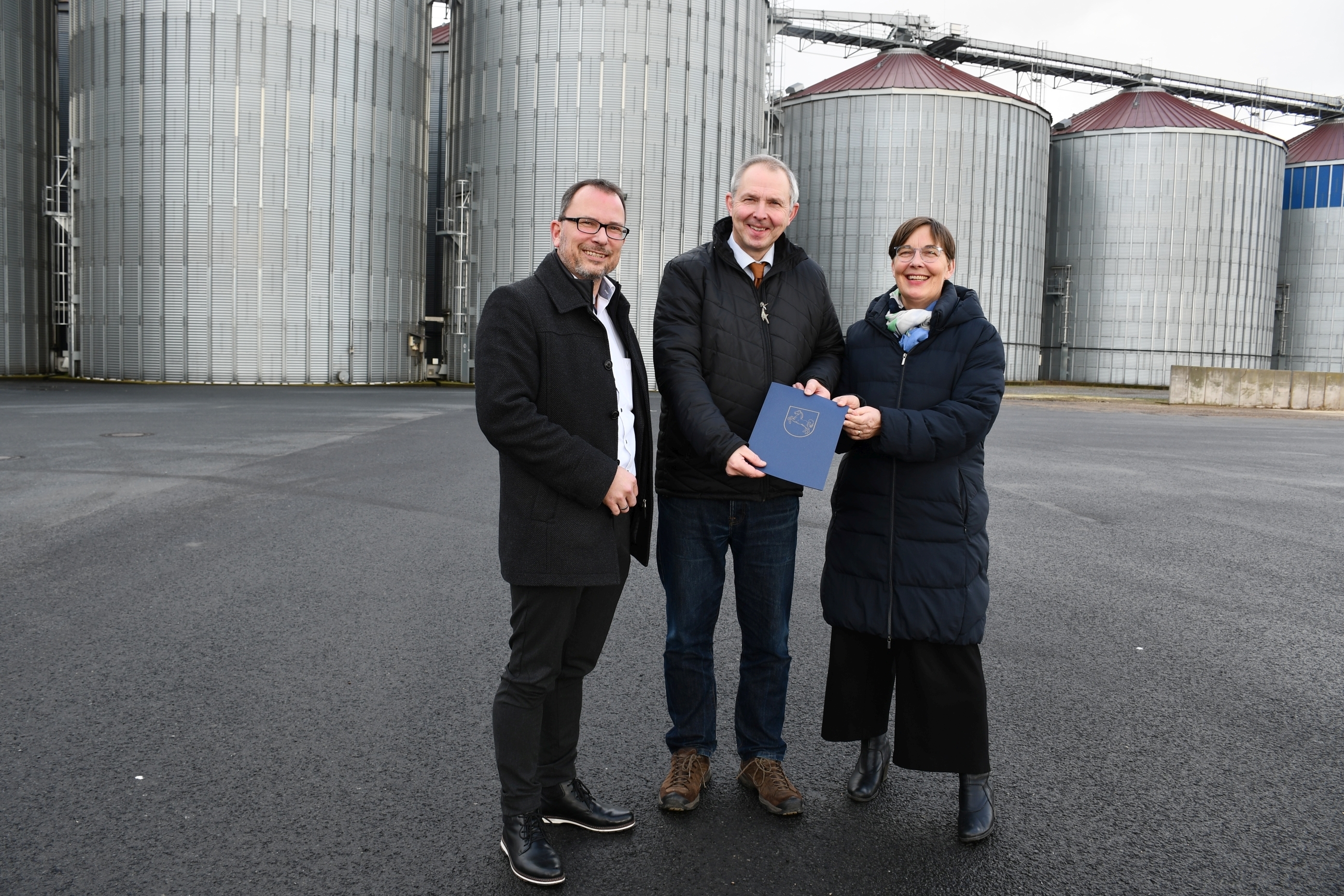 Überreichten den Förderbescheids vor den Getreidesilos (v.l.): Thomas Klein (Wirtschaftsregion Helmstedt GmbH), Geschäftsführer Kurt Fromme, Landesbeauftragte Dr. Ulrike Witt