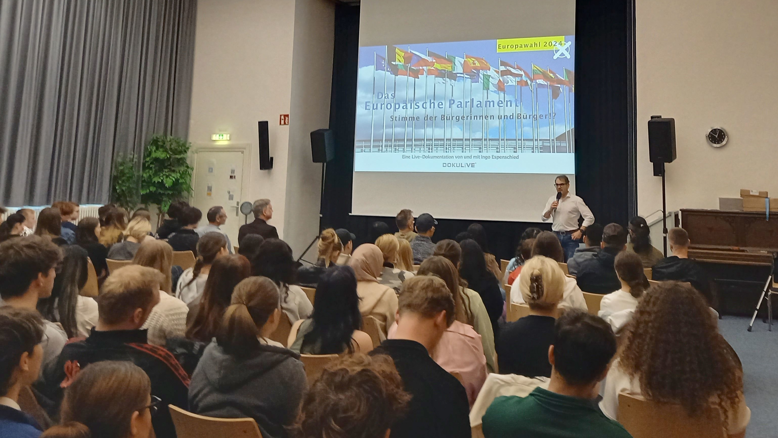 In der Aula der Johannes-Selenka-Schule verfolgten rund 120 Schülerinnen und Schüler - meist im Erstwähler/-innen-Alter - den Vortrag Espenschieds. In der anschließenden Diskussion wurden dann nochmals die Vorteile des Zusammenschlusses in der EU und die Wichtigkeit jeder Stimmabgabe bei der Wahl herausgearbeitet.