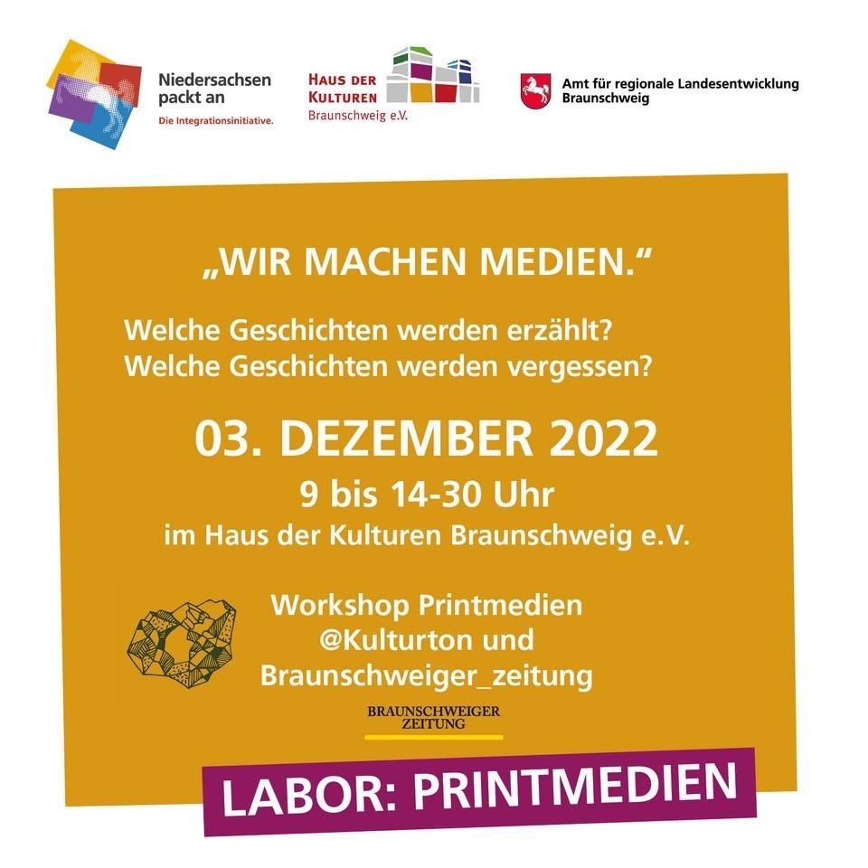 Das Amt für regionale Landesentwicklung und das Haus der Kulturen Braunschweig e.V. laden zu kostenlosen Medienlaboren zum Thema Integration ein. Entwickeln Sie in praktischen Workshops gemeinsam mit Medienprofis Ideen, Strategien und konkrete Aktionen!