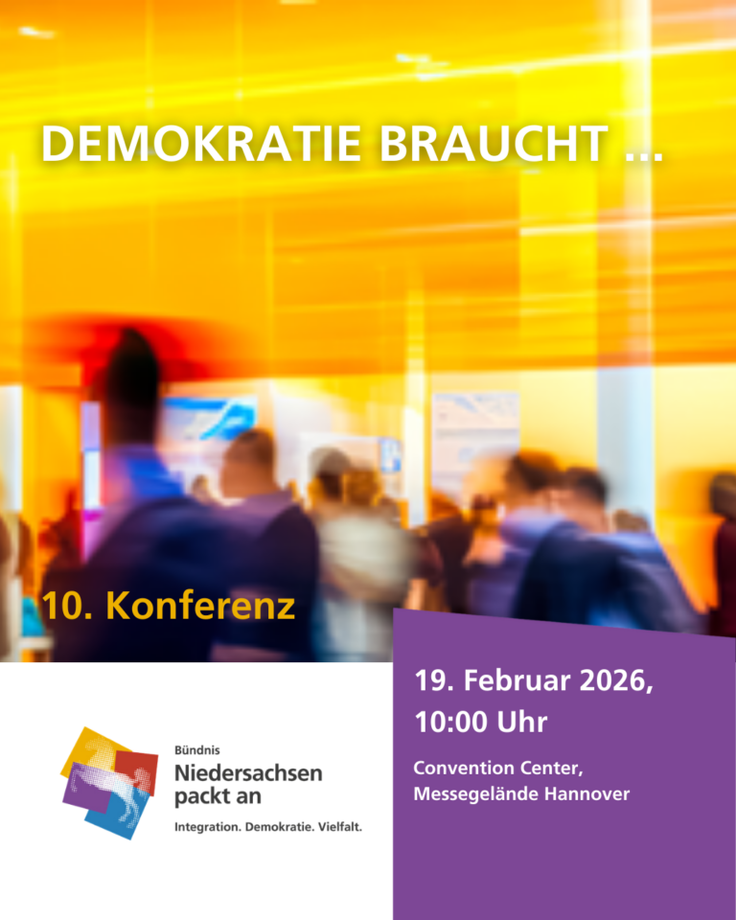 Im Namen aller Bündnispartnerinnen und -partner lädt der Niedersächsische Ministerpräsident Olaf Lies am 19. Februar 2026 zu einer Demokratiekonferenz ein, um gemeinsam eine positive Vision für ein integrationsfreundliches, zukunftsorientiertes Niedersachsen zu entwerfen und zu zeigen, wofür es sich lohnt, sich zu engagieren.