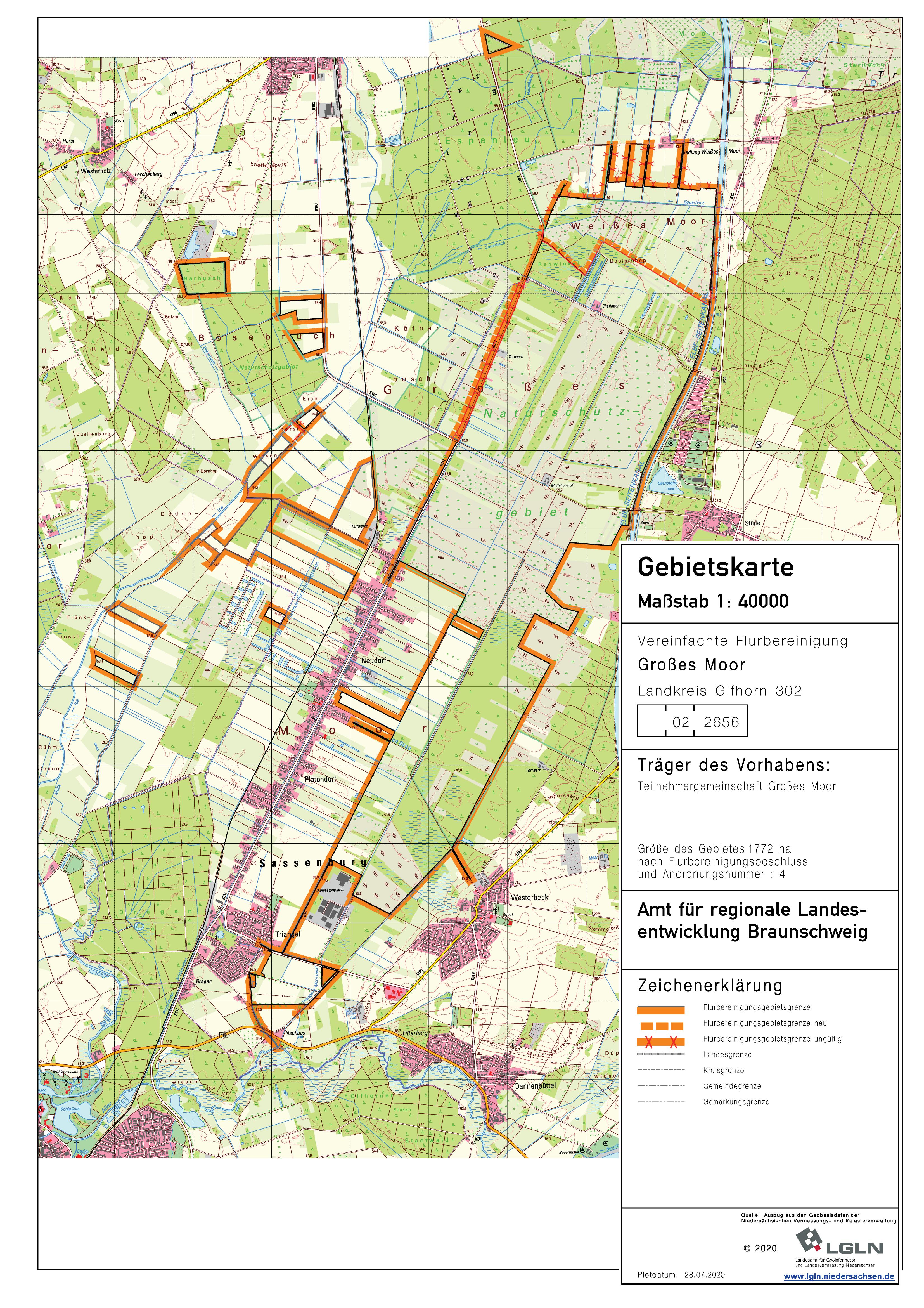 Eine Übersichtskarte, die Überleitungsbestimmungen und die öffentliche Bekanntmachung zur vorläufigen Besitzeinweisung liegen ab dem 16.07.2024 in der Zeit der jeweiligen Geschäftszeiten bei der Gemeinde Sassenburg und dem Amt für regionale Landesentwicklung Braunschweig zur Einsichtnahme aus.
